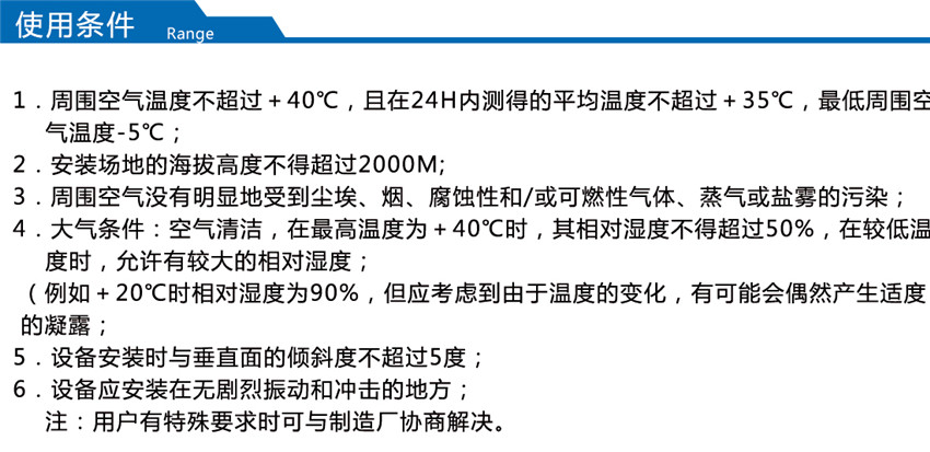 2. 大氣條件:空氣清潔,相對濕度在最高溫度+40℃時不超過50﹪;在較低溫度時允許有較高的相對濕度,例如20℃時為90﹪,但應考慮到由于溫度的變化,有可能會偶然地產生適度的凝露。