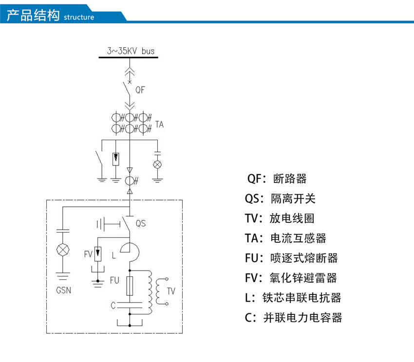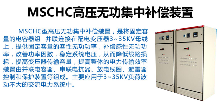 MSCHC型高壓無功集中補償裝置,是將固定容量的電容器組 并聯(lián)連接在配電變壓器3~35kV母線上,提供固定容量的容性無功功率,補償感性無功功率,改善功率因數(shù),穩(wěn)定系統(tǒng)電壓,從而降低線路損耗,提高變壓器傳輸容量,提高整體的電力傳輸效率。裝置由并聯(lián)電容器、串聯(lián)電抗器、放電線圈、避雷器、控制和保護(hù)裝置等組成。主要應(yīng)用于3~35kV負(fù)荷波動不大的交流電力系統(tǒng)中