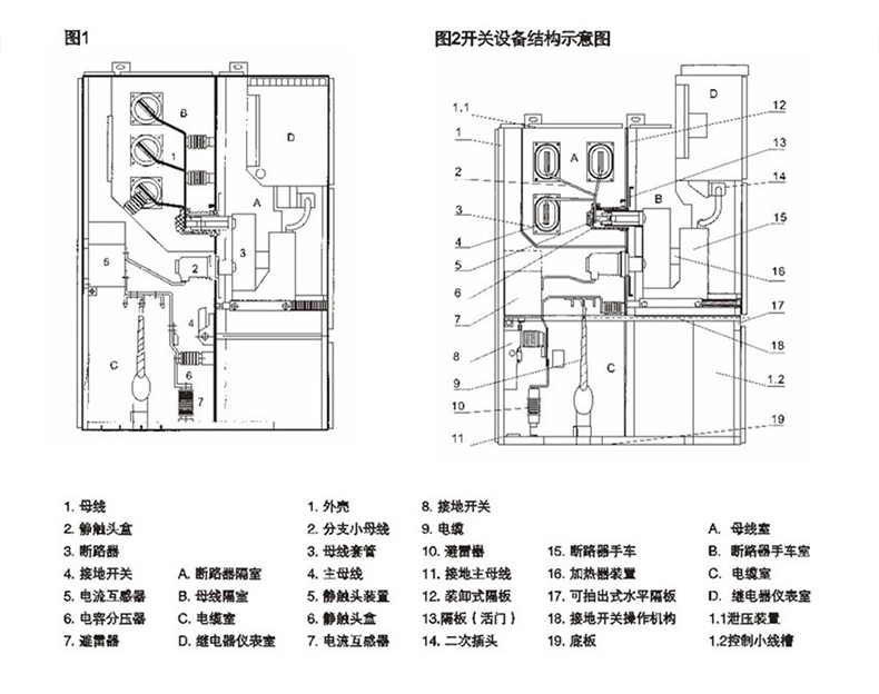 5、柜體分為手車室、母線室、電纜室、繼電器及儀表室。手車室后部裝有接地的金屬活門,手車抽出后,活門自動關閉;二次觸頭,隨手車進出實現通、斷;母線室與其它室隔開;電纜室位于后下部,便于敷設進出線電纜,底部裝有接地母線;繼電器及儀表室位于柜的前上部。