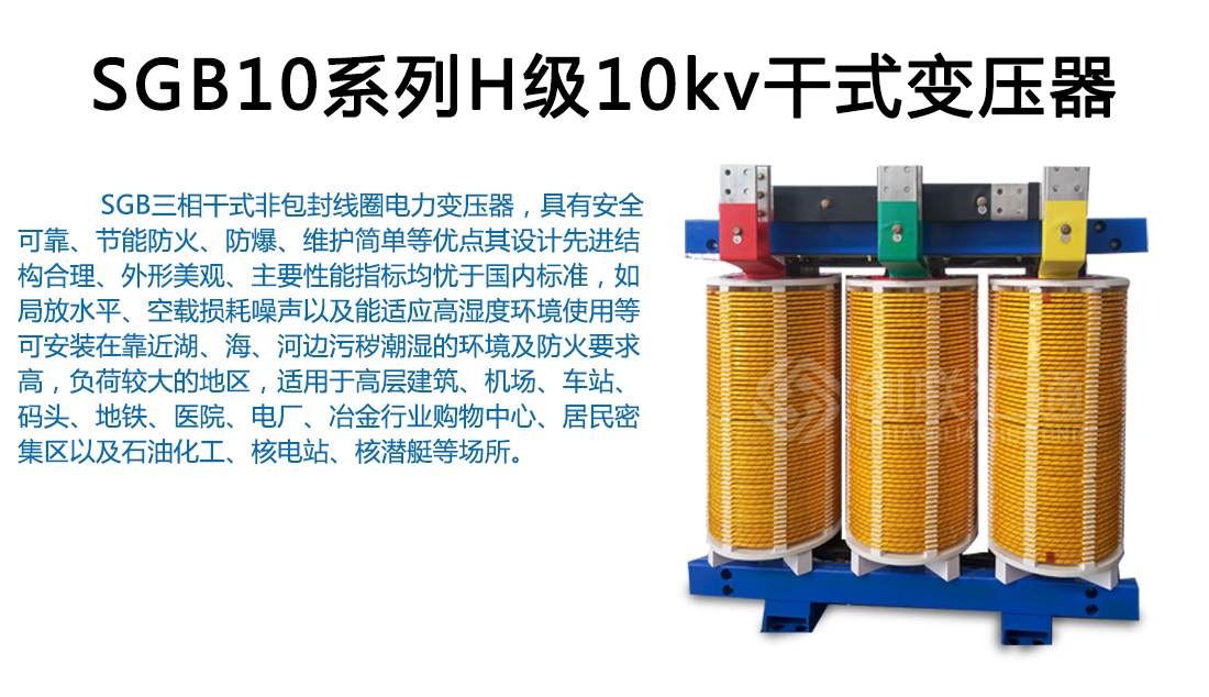 SG(B)10系列H級絕緣干式變壓器采用優質環保材料,先進的生產檢測設備按嚴格的工藝生產而成,具有高性能、高安全、承受熱沖擊能力強等特點,它適用于防火要求高、負荷波動大以及污穢潮濕的惡劣環境中。如:高層建筑、商業中心、住宅小區、醫院、化工廠、核電站、船舶及其它安全性要求防火、防爆、防潮的配電網絡與工礦企業供配電系統等重要或特殊環境場所。