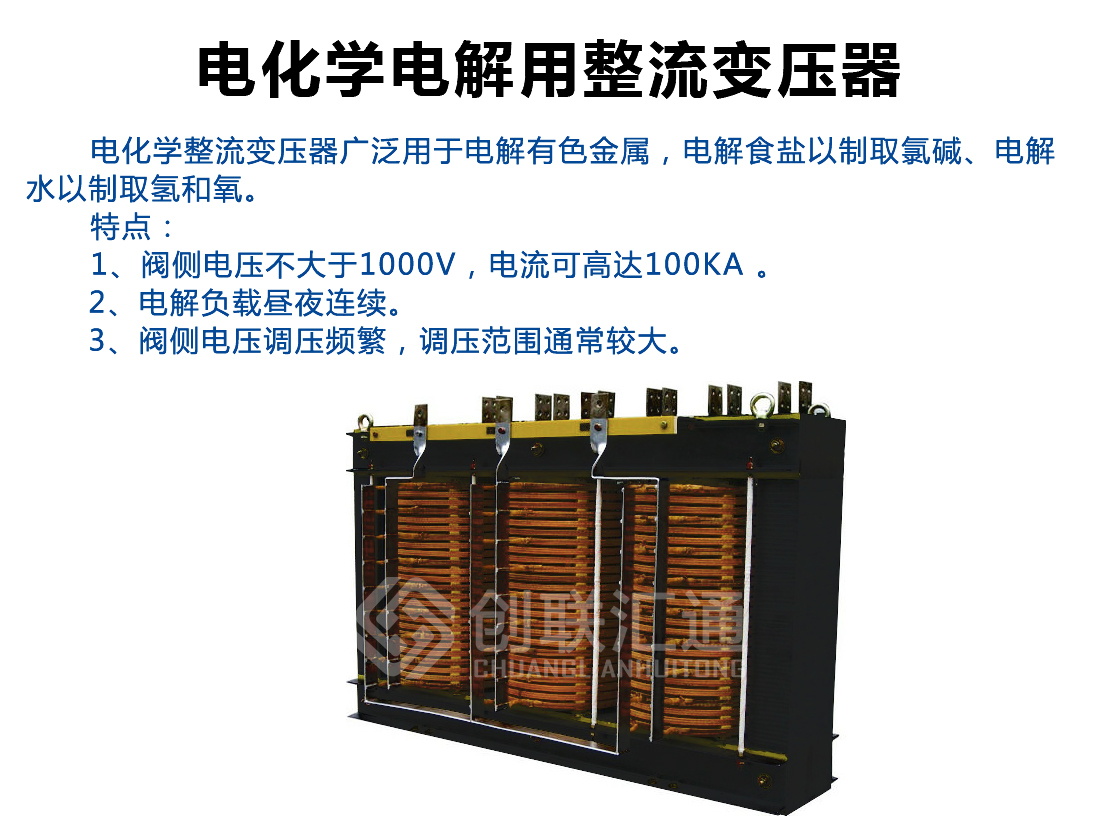 廣泛應用于電化學工業,這是應用整流變最多的行業,電解有色金屬化合物以制取鋁、鎂、銅及其它金屬;電解食鹽以制取氯堿;電解水以制取氫和氧等領域。